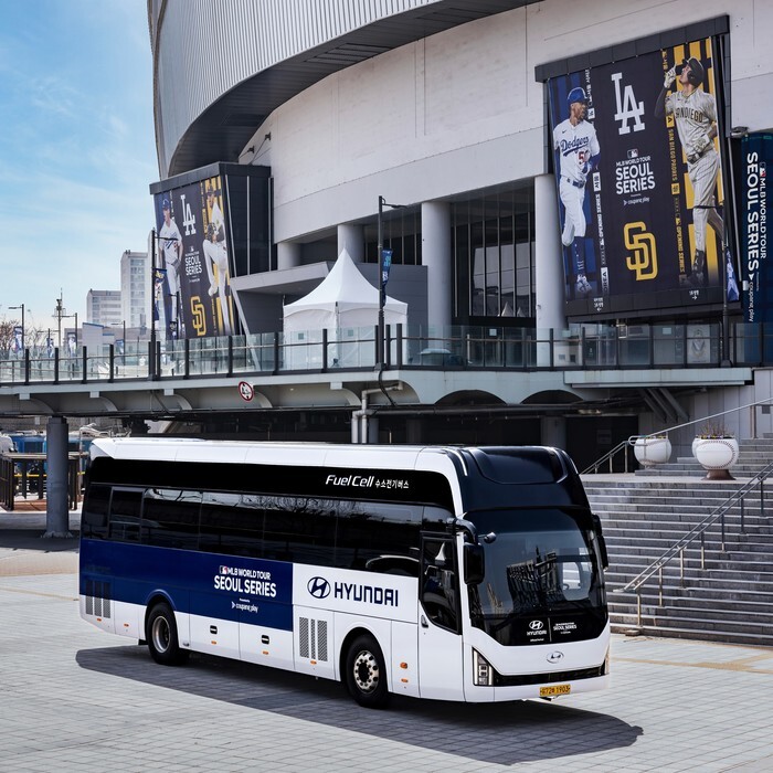 This photo, provided by Hyundai Motor Co. on March 19, 2024, shows a hydrogen fuel cell bus, sponsored by the carmaker for the Major League Baseball season-opening series between the Los Angeles Dodgers and the San Diego Padres, set for March 20-21 at Gocheok Sky Dome in Seoul. (PHOTO NOT FOR SALE) (Yonhap)