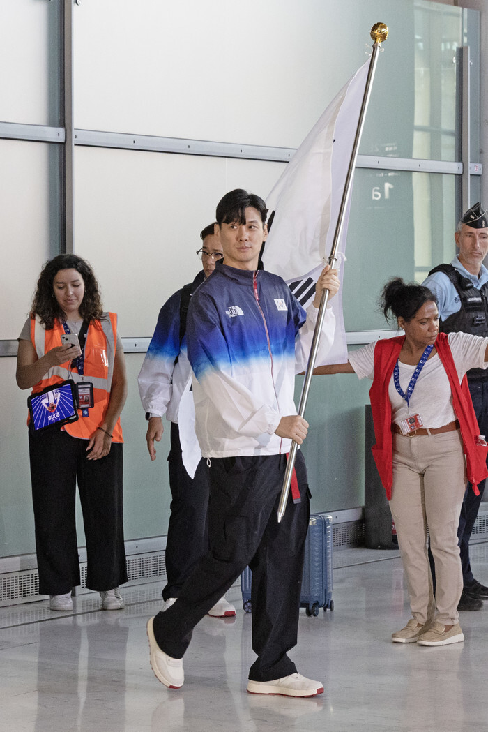 South Korean fencer Gu Bon-gil carries the national flag, Taegeukgi, with the rest of South Korea's main Olympic delegation upon arriving at Charles de Gaulle Airport in Paris on July 20, 2024 (local time), to compete in the Paris Olympics set to open next week. (Yonhap)