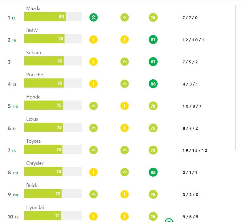 컨슈머리포트는 브랜드별 주행 평가와 신뢰성, 고객 만족도, 안전성(충돌 테스트) 등의 점수를 합산해 순위를 매긴다.