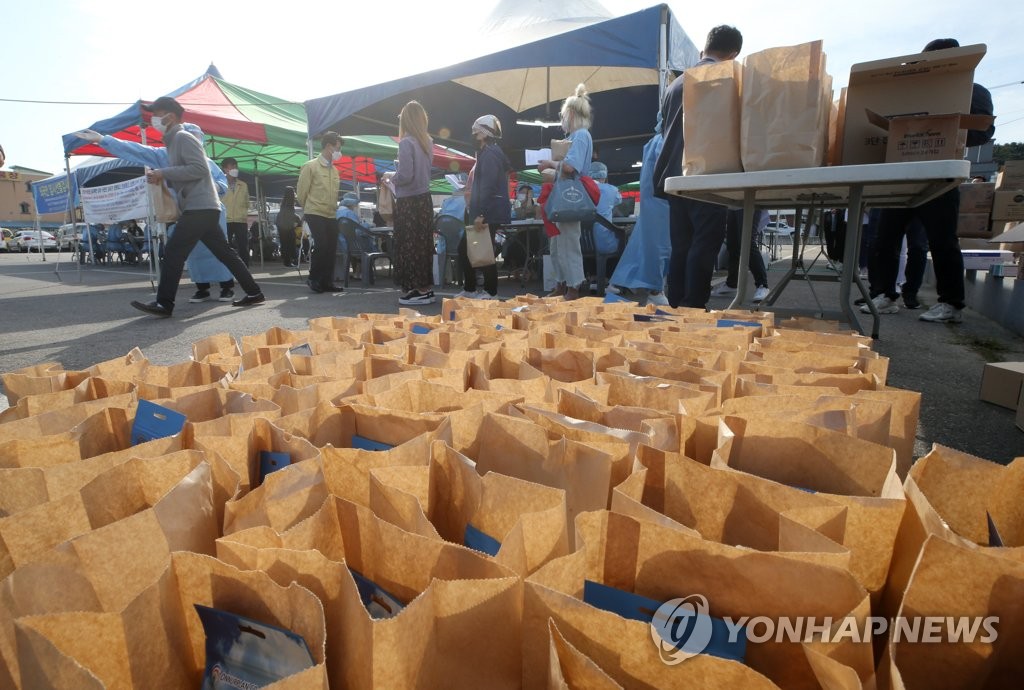 | ▲ This photo taken on May 12, 2021, shows paper bags that contain bread, masks and disinfectants for foreigners undergoing coronavirus tests in Gangneung, 240 kilometers east of Seoul. (Yonhap) |