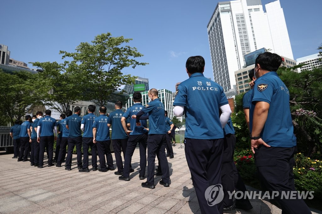 | ▲ This photo taken on Aug. 16, 2021, shows police officers waiting to take a coronavirus test at a makeshift testing facility in downtown Seoul. (Yonhap) |