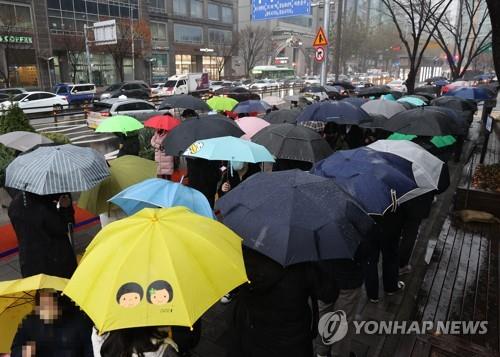 | ▲ People stand in line in the rain to receive coronavirus tests at a screening clinic in Seoul's Songpa Ward on Nov. 30, 2021. |