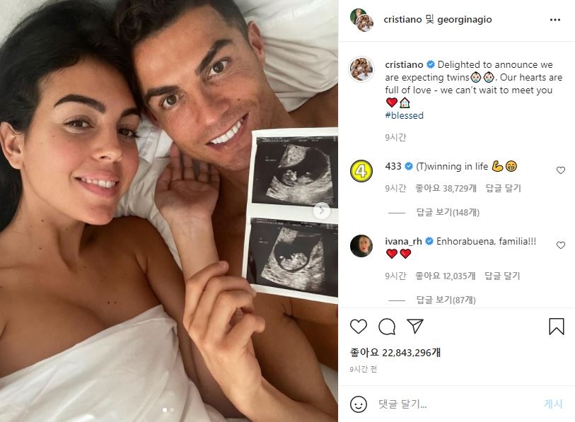 초음파 사진을 들고 로드리게스와 함께 찍은 사진을 공개한 호날두는 "우리가 쌍둥이를 기다리고 있다는 사실을 알리게 돼 기쁘다. 우리의 마음은 사랑으로 가득 차 있다. 어서 만나고 싶다"고 벅찬 감정을 드러냈다.