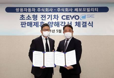 (서울=연합뉴스) 장하나 기자 = 캠시스[050110]의 전기차 사업 부문 자회사 쎄보모빌리티는 쌍용차[003620]와 초소형 전기차 CEVO(쎄보)-C SE의 판매 제휴를 위한 업무협약(MOU)을 맺었다고 31일 밝혔다.
