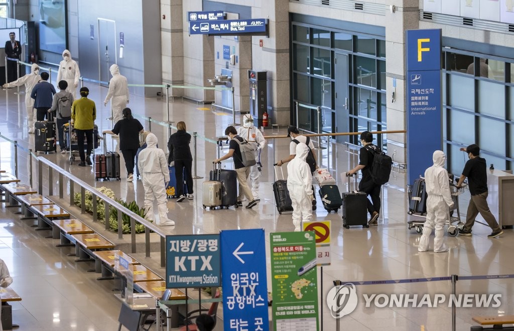 | ▲ Health workers in protective suits guide arrivals from India at Incheon International Airport, west of Seoul, on May 9, 2021. (Yonhap) |
