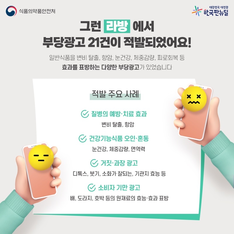 식품의약품안전처는 주요 실시간상거래 방송 플랫폼 업체 12곳의 117개 방송을 지난 3월부터 이달 중순까지 점검한 결과 업체 6곳에서 부당광고 21건을 적발해 게시물 삭제와 행정처분 등을 관계 기관에 요청했다고 22일 밝혔다.