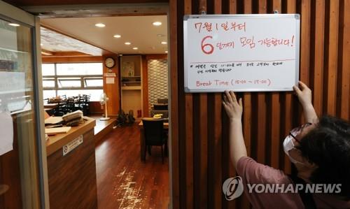 | ▲ An employee puts up a sign at a restaurant in Seoul on June 28, 2021, to inform customers that gatherings of up to six people are allowed starting July 1 under the eased social distancing rules amid the coronavirus pandemic. Under the new Level 2 distancing, the ban on gatherings of five or more people will be eased to six people until July 14 in the greater Seoul area after which the ceiling will go up to eight. (Yonhap) |