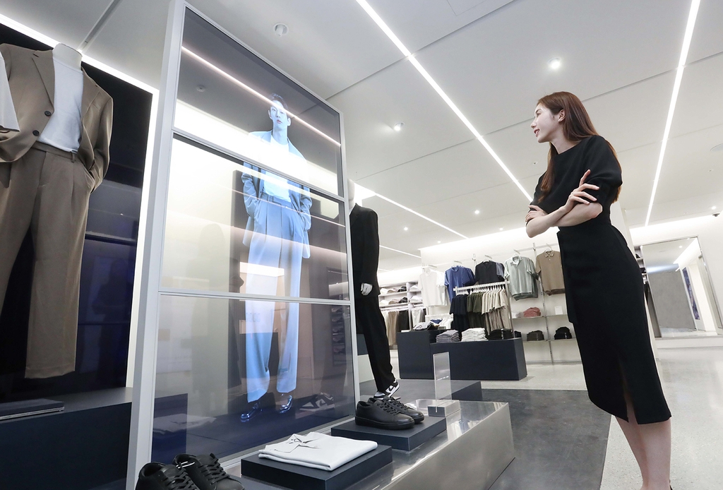 매장 내 설치된 55인치 투명 OLED 쇼윈도는 각종 제품 정보를 실시간으로 보여줄 뿐만 아니라, 쇼윈도 속 실제 제품에 가상 이미지를 겹치는 방식으로 여러 콘텐츠를 표현한다.