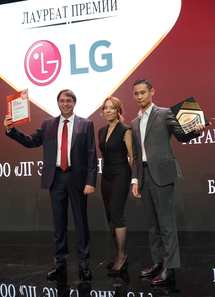 | ▲ LG전자가 러시아 소비자원이 주관하는 '고객만족대상'에서 3년 연속으로 '가전 서비스 부문' 대상을 수상했다. 지난 8일에 열린 시상식에서 LG전자 러시아법인 직원들이 수상하는 모습. [LG전자 제공. 재판매 및 DB 금지] |