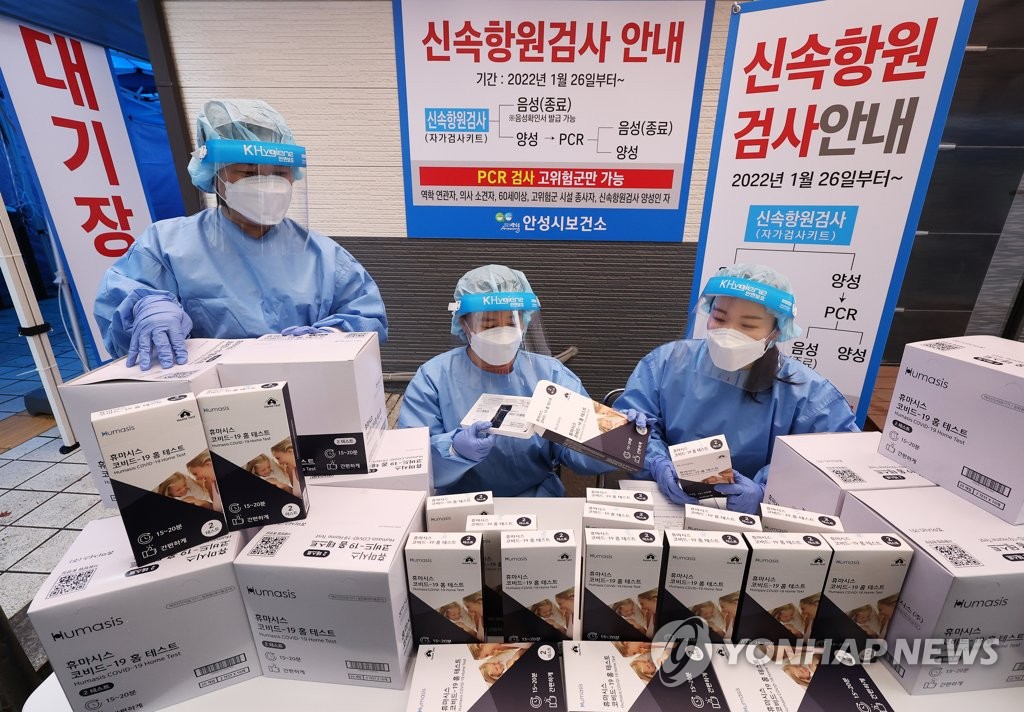 | ▲ Medical workers check COVID-19 self-test kits at a public health center in Anseong, 77 kilometers south of Seoul, on Jan. 25, 2022, one day ahead of the introduction of new quarantine rules, under which polymerase chain reaction (PCR) tests will be available only to high-risk groups, including people aged over 60, residing in four omicron variant-dominated areas -- Gwangju, South Jeolla Province, Pyeongtaek and Anseong. Others in the regions can take PCR tests only after they are confirmed to have been infected with the coronavirus via self-tests. (Yonhap) |