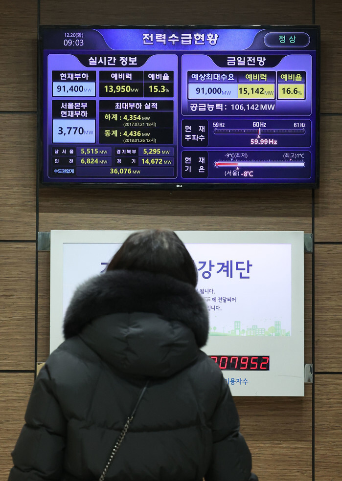 An electric signboard at the Seoul headquarters of Korea Electric Power Corp., South Korea's state-run power company, indicates that the country's maximum power consumption is expected to reach 91,000 megawatts (MW) on Dec. 20, 2022. According to the Korea Power Exchange, the country's maximum power demand hit a wintertime record high of 91,710 MW the previous day, as the country was struck by a cold snap. (Yonhap)