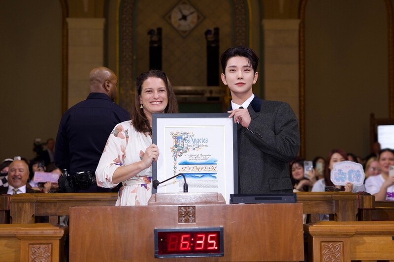 로스앤젤레스 시의회는 8일(이하 현지시간) 멤버 조슈아를 시청으로 대표로 초청해 감사패를 수여했다. 이는 예술, 문화, 커뮤니티에 기여한 단체와 개인에게 주어지는 감사패다. 로스앤젤레스 시의회는 세븐틴이 공연과 이와 연계한 이벤트인 '더 시티 프로젝트'로 도시를 널리 알린 점을 높이 평가했다.