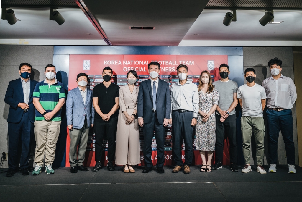 | ▲ 기념 촬영하는 최영일 이사(왼쪽부터)와 샘 해밍턴 이사, 권병규 감사, 조원희, 김수정 사진작가, 조병득 이사장, 박승국 감사, 박지혜 아나운서, 현영민 이사, 이영표 이사, 이수민 사무국장. [대한축구협회 제공. 재판매 및 DB 금지] |