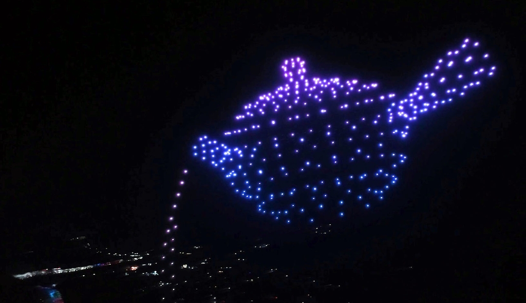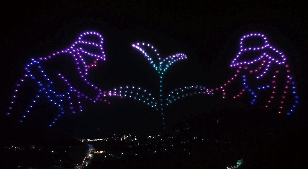 군집한 드론은 인근 십리벚꽃길 조명과 어우러져 아름다운 광경을 만들었다.