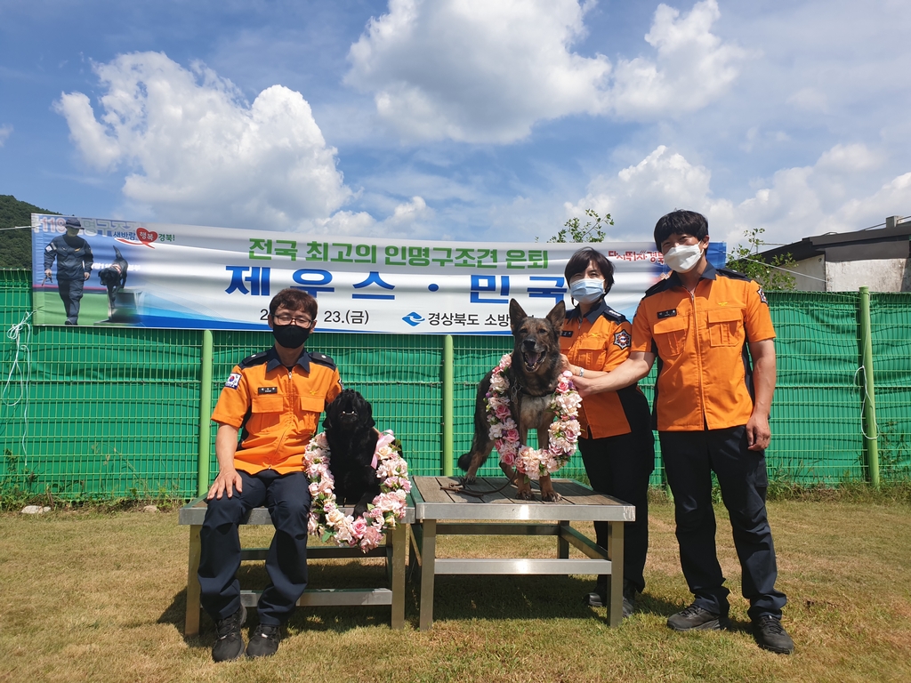 (안동=연합뉴스) 이강일 기자 = 경북도소방본부는 119 특수구조단에서 활동한 구조견 '제우스'와 '민국'이 은퇴했다고 25일 밝혔다.