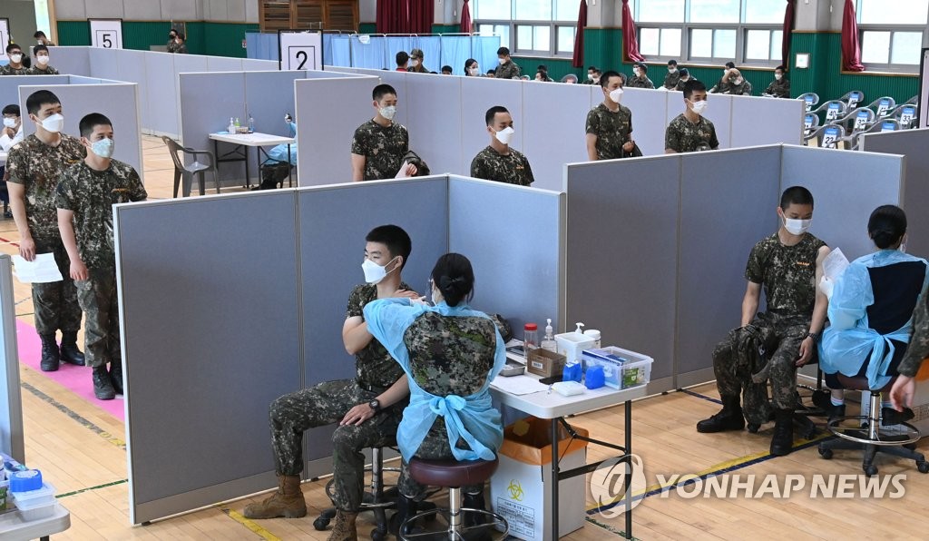 | ▲ This photo taken on June 24, 2021, and provided by the National Assembly press corps, shows soldiers receiving coronavirus vaccines at a military unit in Goyang, Gyeonggi Province. (PHOTO NOT FOR SALE) (Yonhap) |
