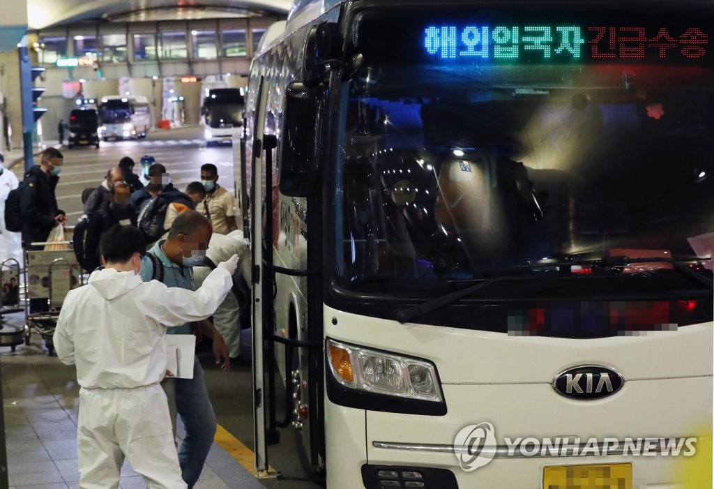 | ▲ Foreign entrants get on a bus at Incheon International Airport on Dec. 2, 2021, that will take them to a government-designated facility for a 10-day mandatory quarantine imposed after South Korea reported its first cases of the omicron variant this week. (Yonhap) |