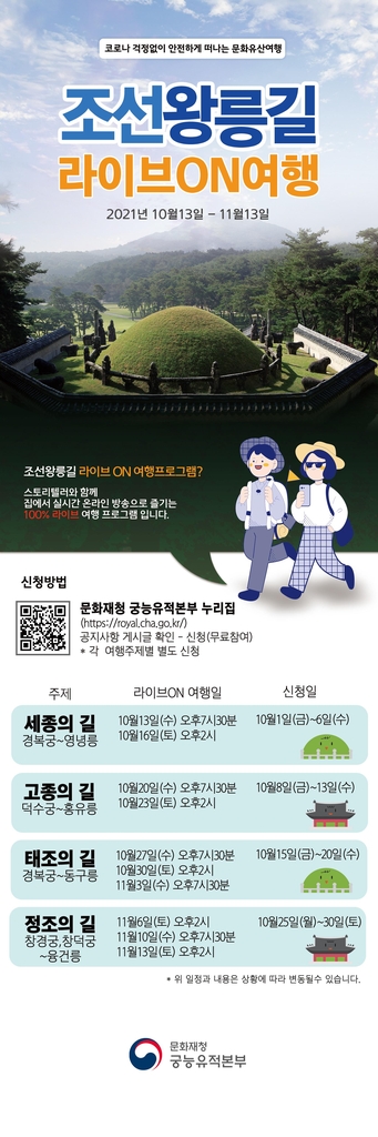 ▲ 문화재청 궁능유적본부는 다음 달 13일부터 11월 13일까지 총 10회에 걸쳐 온라인 여행 프로그램 '조선왕릉 길 라이브ON(온)'을 운영한다.
