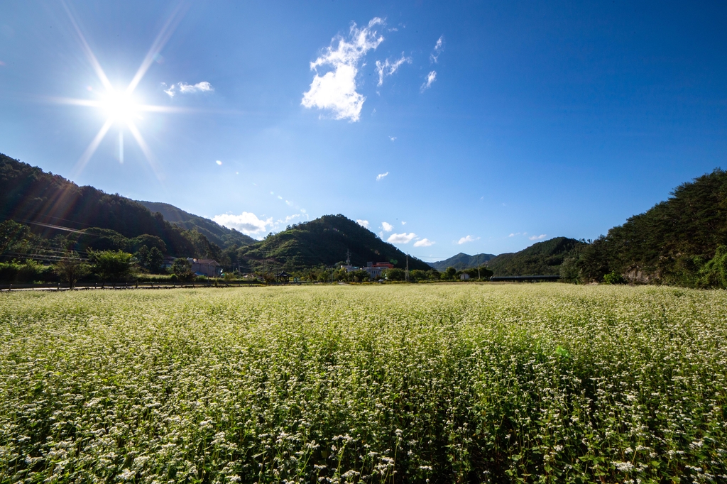 (옥천=연합뉴스) 충북 옥천군 청성면 거포리의 장연천변 1만4천㎡ 부지에 메밀꽃이 하얗게 만개했다.