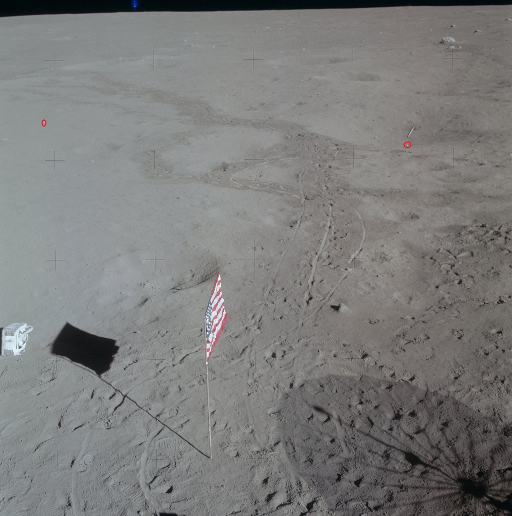 | ▲ 달에서 친 골프공(붉은 원 안) 오른쪽 상단은 약 24야드 날아간 첫 번째 공. 그 뒤로 보이는 막대는 미첼이 던진 장대. 왼쪽 상단은 약 40야드 날아간 두번째 공. [NASA 제공] |