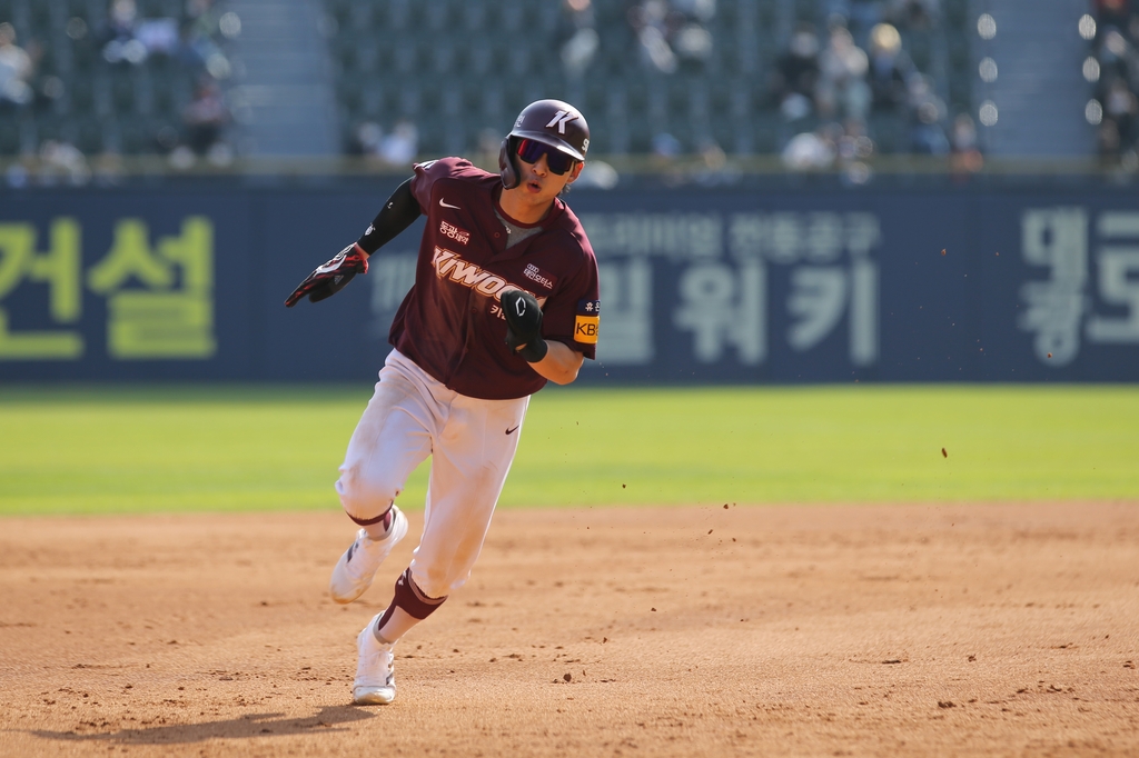 | ▲  Lee Jung-hoo of the Kiwoom Heroes runs the bases against the Doosan Bears during the top of the fifth inning of a Korea Baseball Organization regular season game at Jamsil Baseball Stadium in Seoul on April 17, 2022, in this photo provided by the Heroes. (PHOTO NOT FOR SALE) (Yonhap) |