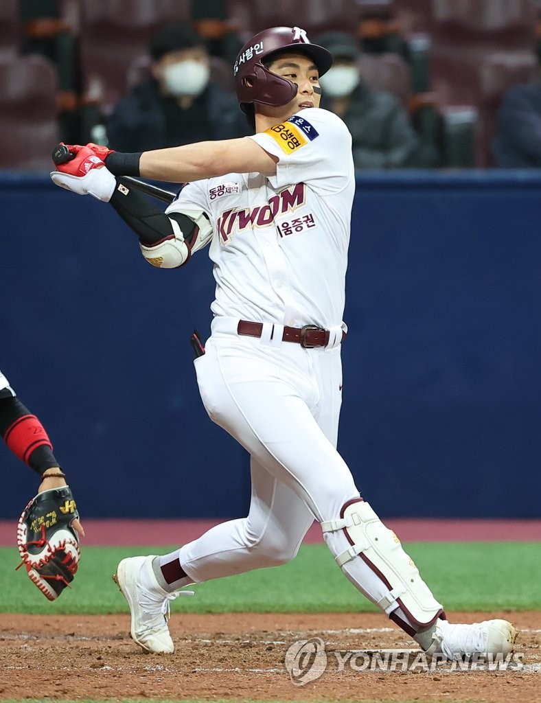 | ▲  Lee Jung-hoo of the Kiwoom Heroes hits a single against the Doosan Bears during the top of the fifth inning of a Korea Baseball Organization regular season game at Jamsil Baseball Stadium in Seoul on April 17, 2022, in this photo provided by the Heroes. (PHOTO NOT FOR SALE) (Yonhap) |