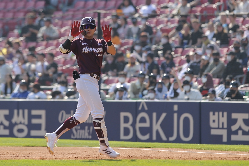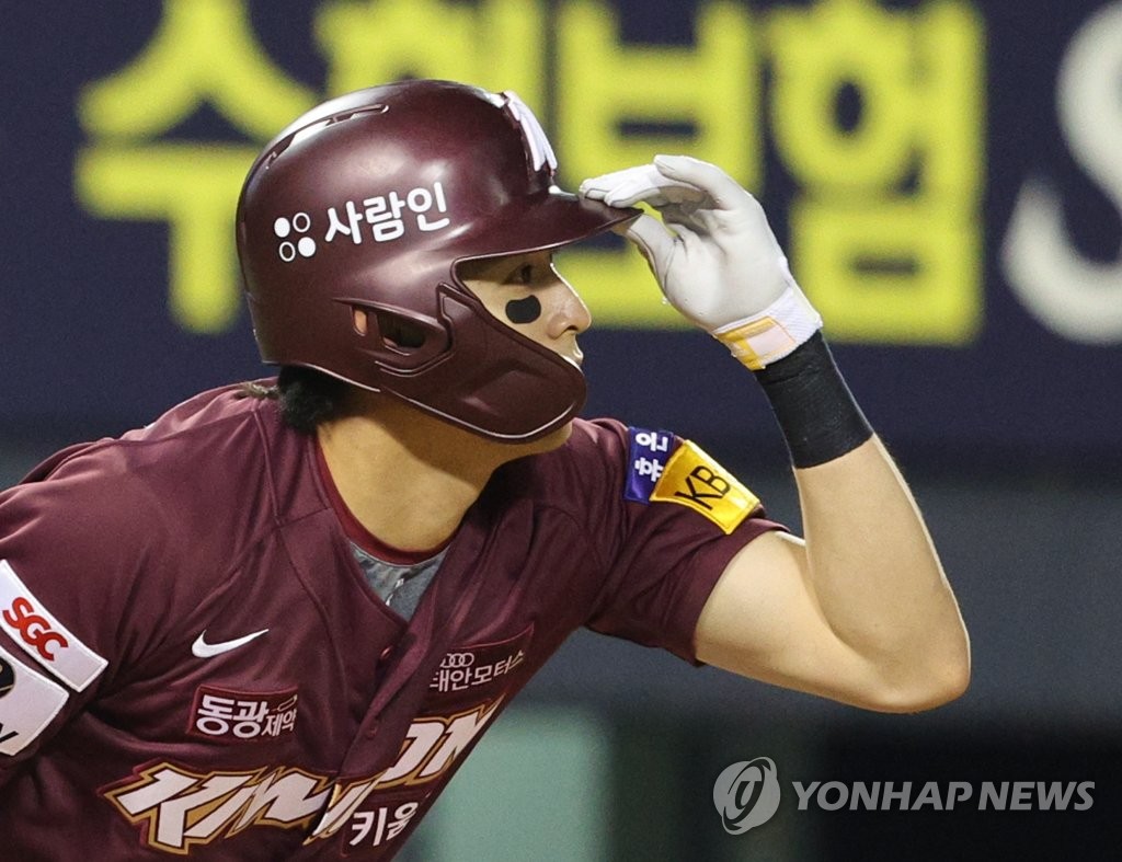 | ▲  Lee Jung-hoo of the Kiwoom Heroes heads to first base after hitting a single against the Doosan Bears during the top of the seventh inning of a Korea Baseball Organization regular season game at Jamsil Baseball Stadium in Seoul on April 15, 2022. (Yonhap) |