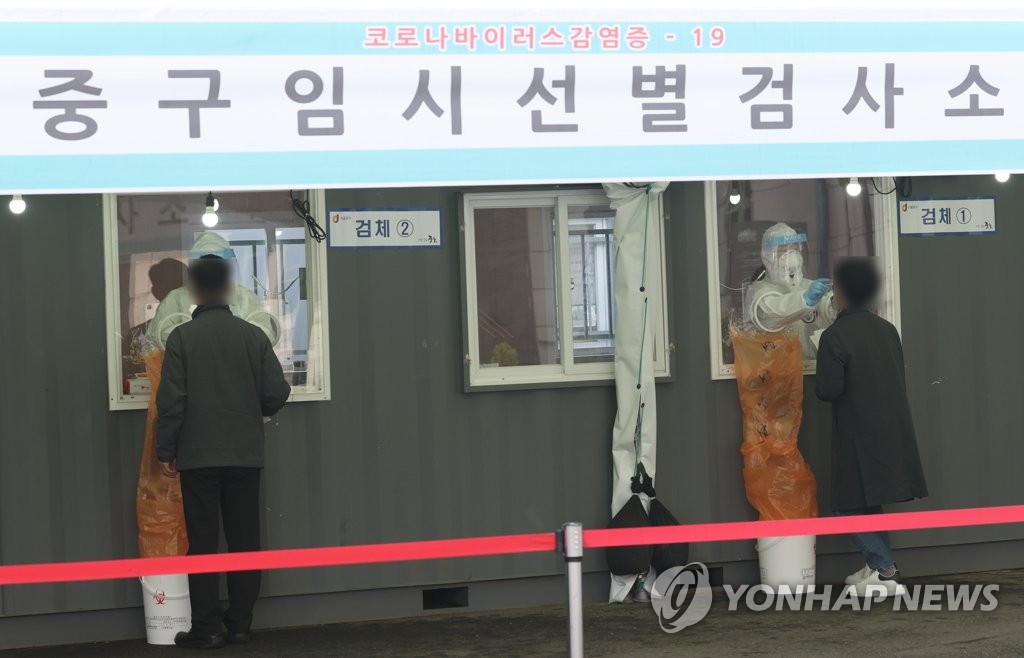 | ▲ People receive coronavirus tests at a makeshift clinic in front of Seoul Station on March 26, 2021. (Yonhap) |