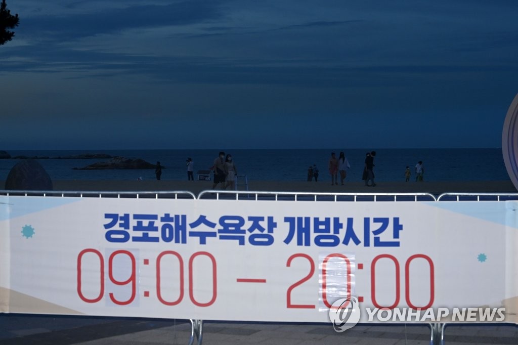 | ▲ 강릉 거리두기 4단계…경포해변 야간 폐쇄 (강릉=연합뉴스) 양지웅 기자 = 신종 코로나바이러스 감염증(코로나19) 확진자 폭증으로 강원 강릉시의 사회적 거리두기 단계가 4단계로 격상된 19일 경포해수욕장 입구에 개방 시간을 알리는 대형 현수막이 붙어 있다.