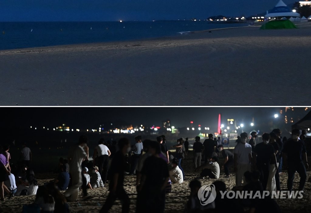 | ▲ 강릉 거리두기 4단계…텅 빈 경포해변 (강릉=연합뉴스) 양지웅 기자 = 신종 코로나바이러스 감염증(코로나19) 확진자 폭증으로 강원 강릉시의 사회적 거리두기 단계가 4단계로 격상된 19일 오후 경포해수욕장(위)이 야간 통제로 텅 비어 지난 17일 오후 관광객이 북적이던 모습(아래)과 대조를 이루고 있다.