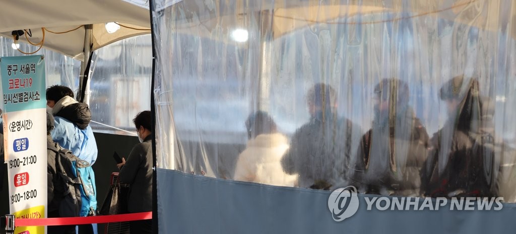 ▲ Citizens stand in line to take coronavirus tests at a screening clinic in front of Seoul Station on Jan. 5, 2022. (Yonhap)
