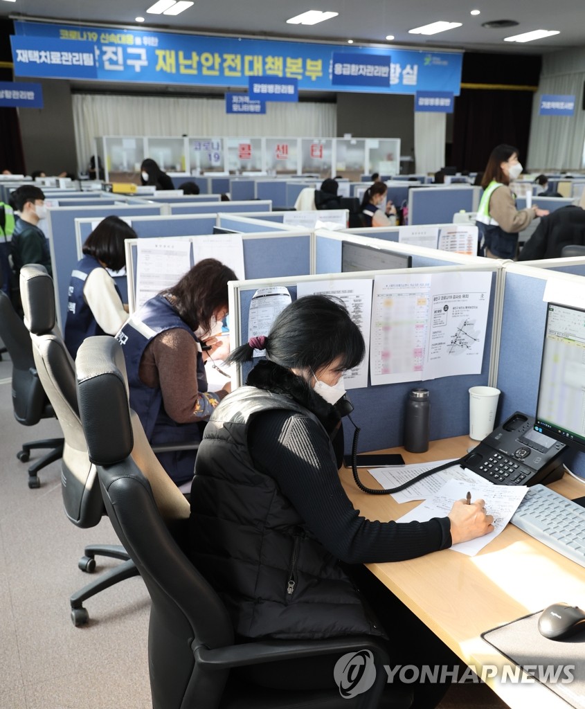 | ▲ Officials talk with COVID-19 patients receiving at-home treatment over the phone at a disaster center in Seoul on Feb. 21, 2022, when the cumulative number of such patients surpassed 2 million. (Yonhap) |