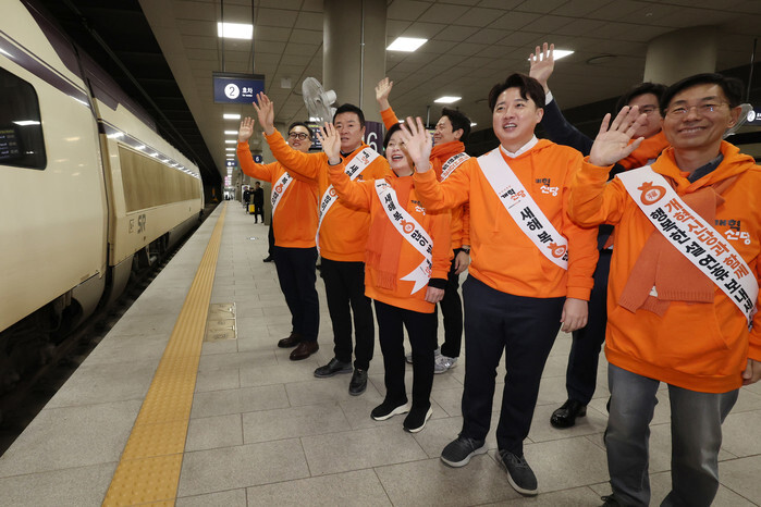 The leadership of the minor Reformative Conservative Party, including the party's leader, Lee Jun-seok (2nd from R, front), waves to people heading to their hometowns at Seoul's Suseo Station, the starting point of a high-speed railway service known as the Super Rapid Train, on Feb. 8, 2024, as South Korea's annual exodus for Seol, Lunar New Year's Day, begins. The holiday, which runs from Feb. 9-12 this year, is a time for family reunions, with Koreans traditionally offering a ritual feast to their ancestors. (Yonhap)