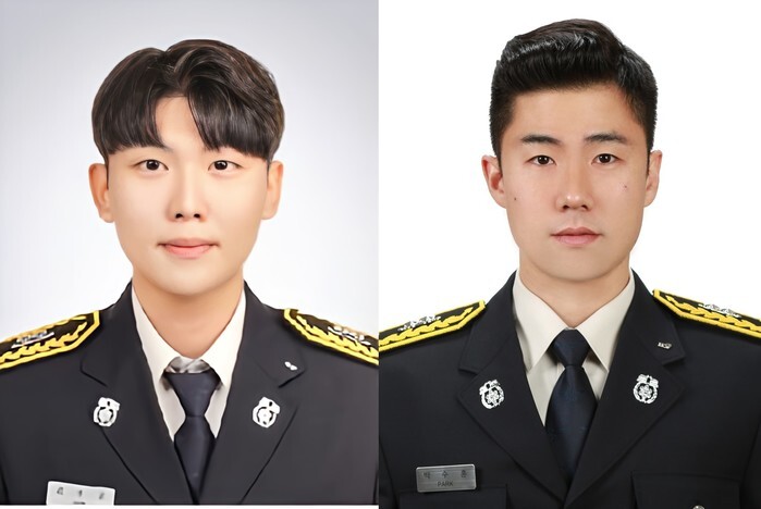 This photo, provided by the North Gyeongsang Provincial Fire Service, shows firefighters Kim Soo-kwang (L), 27, and Park Soo-hoon, 35, who lost their livesin the line of duty searching for the victims of a fire at a meat processing factory in Mungyeong, 140 kilometers southeast of Seoul, on Feb. 1, 2024. (PHOTO NOT FOR SALE) (Yonhap)