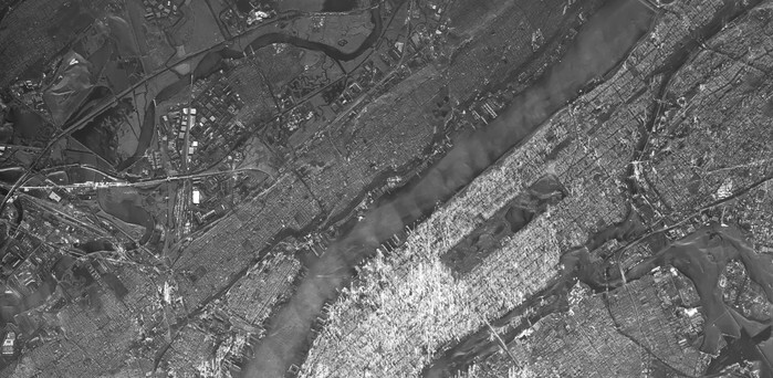 This photo, unveiled by Hanwha Systems Co., the defense and ICT unit of South Korea's Hanwha Group, is one of the images captured by its small synthetic aperture radar (SAR) satellite. It shows Manhattan in New York. The satellite, the country's first private observation satellite, was launched in December 2023. (PHOTO NOT FOR SALE) (Yonhap)