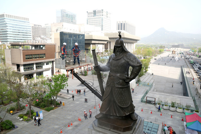 Workers spray water on the statue of Joseon Dynasty (1392-1910) Adm. Yi Sun-sin at Gwanghwamun Square in downtown Seoul on April 17, 2024, to remove dirt as part of springtime cleaning. (Pool photo) (Yonhap)