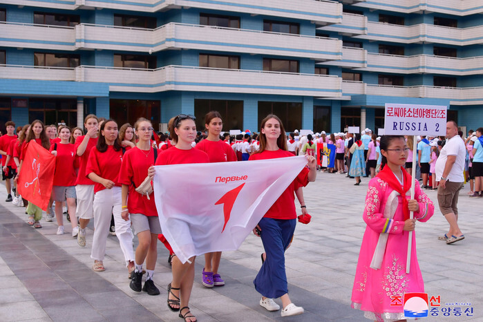 This photo, provided by North Korea's official Korean Central News Agency, shows a Russian delegation participating in a ceremony starting a North Korea-Russia children's friendship camping at the Songdowon International Children's Camp in Wonsan, Kangwon Province, on July 24, 2024. (For Use Only in the Republic of Korea. No Redistribution) (Yonhap)