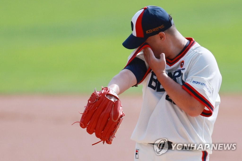 두산 선발 투수 유희관이 1회초 무사 주자 만루에 삼성 오재일에게 2타점 적시타를 맞은 뒤 마운드에서 땀을 닦고 있다. 2021.10.3 hihong@yna.co.kr |