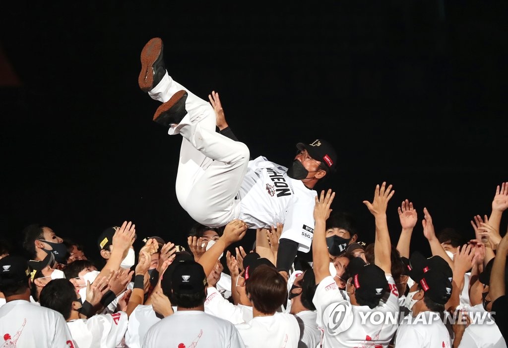 | ▲ 박정권 은퇴 응원하는 동료들 (인천=연합뉴스) 윤태현 기자 = 2일 인천 SSG 랜더스필드에서 열린 프로야구 SSG 랜더스와 kt 위즈의 경기. 경기 종료 후 열린 SSG 박정권 은퇴식에서 SSG 랜더스 선수들이 박정권을 헹가래 치고 있다. 2021.10.2 tomatoyoon@yna.co.kr |