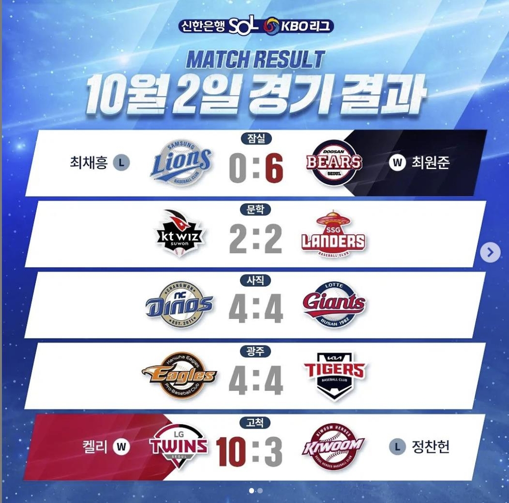 kt wiz와 SSG 랜더스도 2-2로 승패를 가리지 못했다.