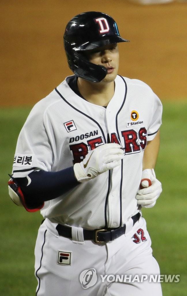 두산 4번 타자 김재환은 최채흥의 초구 슬라이더를 공략해 우중간을 가르는 2타점 2루타를 쳤다.