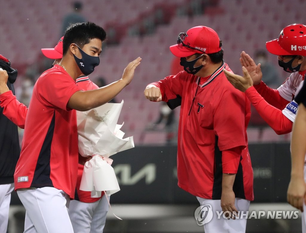 ▲ 다카하시 'KBO 첫 승 신고했어요' (광주=연합뉴스) 조남수 기자 = 1일 광주-기아챔피언스필드에서 열린 2021 프로야구 키움 히어로즈와 KIA 타이거즈의 경기에서 6이닝 무실점 투구로 6-0 완승을 이끈 KIA 다카하시가 코치진으로부터 축하를 받고 있다. 2021.10.1 iso64@yna.co.kr