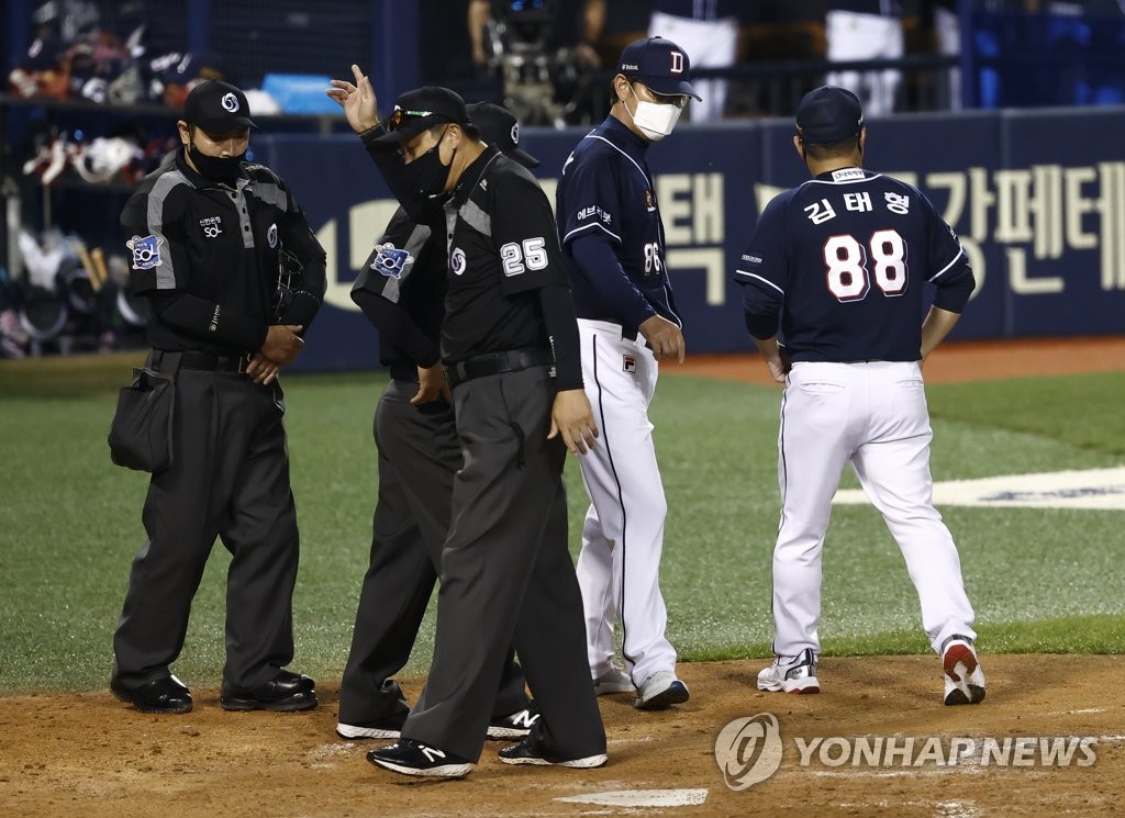 두산 김태형 감독은 이를 항의하다가 퇴장 명령을 받고 더그아웃을 떠났다.