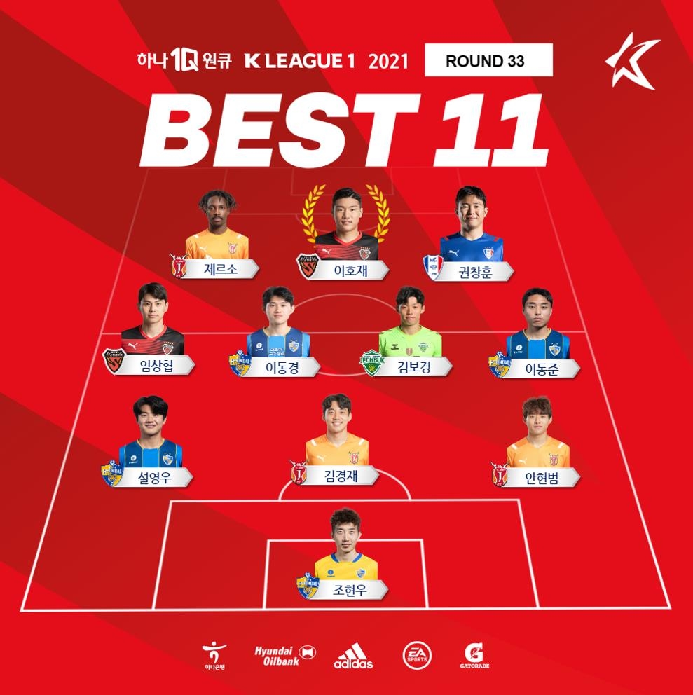 33라운드 베스트11 미드필더로는 임상협(포항), 이동경, 이동준(이상 울산), 김보경(전북)이, 수비수로는 설영우(울산), 김경재, 안현범(이상 제주)이 포함됐다.