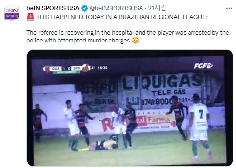 (서울=연합뉴스) 장보인 기자 = 브라질의 한 축구 선수가 경기 중 심판의 머리를 발로 차 의식을 잃게 하면서 경찰에 체포됐다.