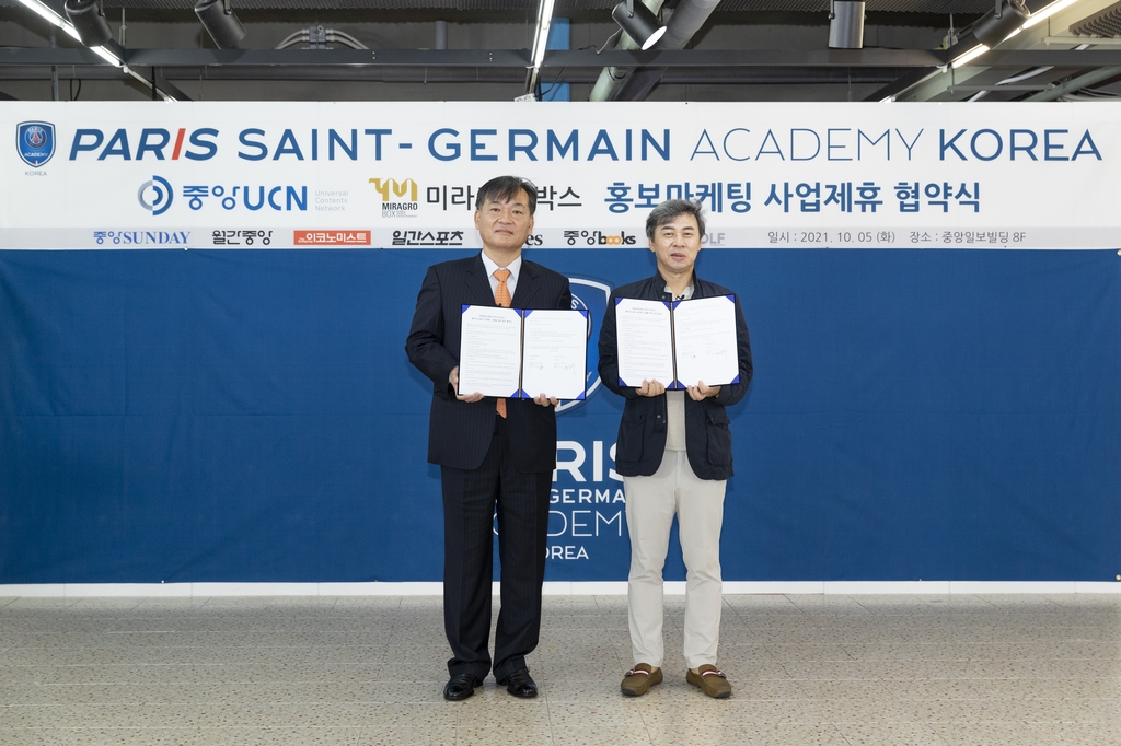 미디어 스타트업 중앙UCN(대표이사 김영승)은 5일 "PSG 아카데미 코리아 주관 운영사인 미라그로박스(대표이사 J.킹 로이)와 업무 협약을 하고 축구 아카데미 사업을 공동 진행하기로 뜻을 모았다"고 밝혔다.