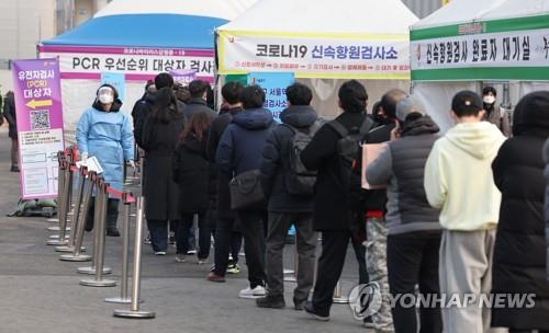 | ▲ People wait in a line to get tested for COVID-19 at a makeshift clinic in Seoul on Feb. 25, 2022. (Yonhap) |