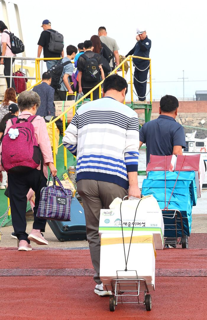 Holidaymakers carrying boxes of gifts prepare to board a ferry bound for the northernmost front-line island of Baengnyeong at a passenger terminal in the coastal city of Incheon, west of Seoul, on Oct. 2, 2025, the eve of a seven-day break for Chuseok, the Korean harvest holiday that falls on Oct. 6 this year and a time for family reunions, with Koreans traditionally offering a ritual feast to their ancestors on Aug. 15 of the lunar calendar. (Yonhap)