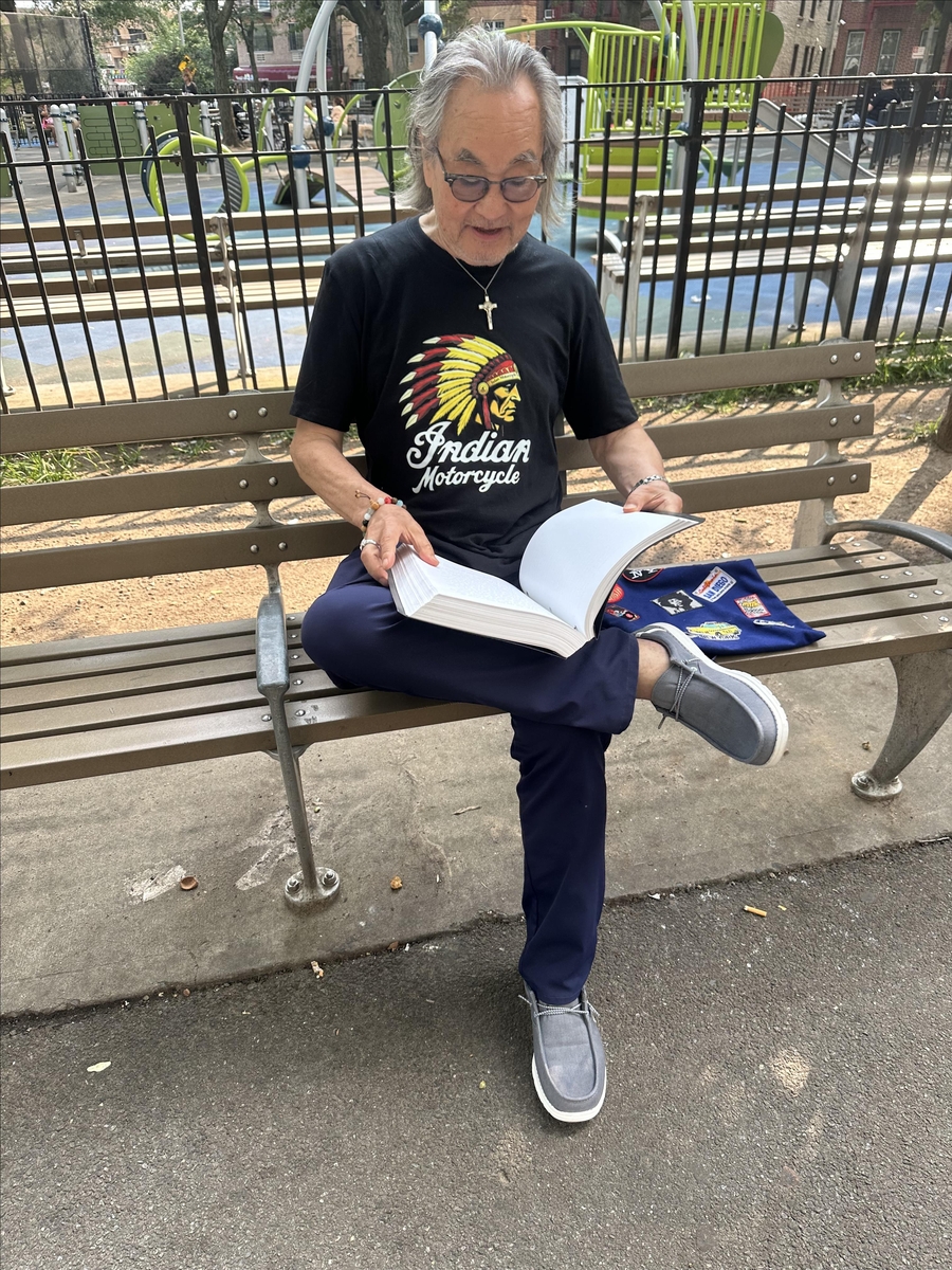▲ 공원에서 아버지가 남긴 책을 읽는 한대수. 행인이 찍어준 사진이다. [한대수 제공. 재판매 및 DB 금지] |