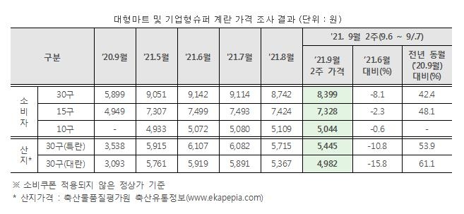 17일 소비자시민모임에 따르면 계란 30개들이 제품의 9월 둘째 주 가격은 8천399원(소비쿠폰 미적용·정상가 기준)으로, 계란 가격이 가장 높았던 6월 평균 9천142원보다 8.1% 내렸다.